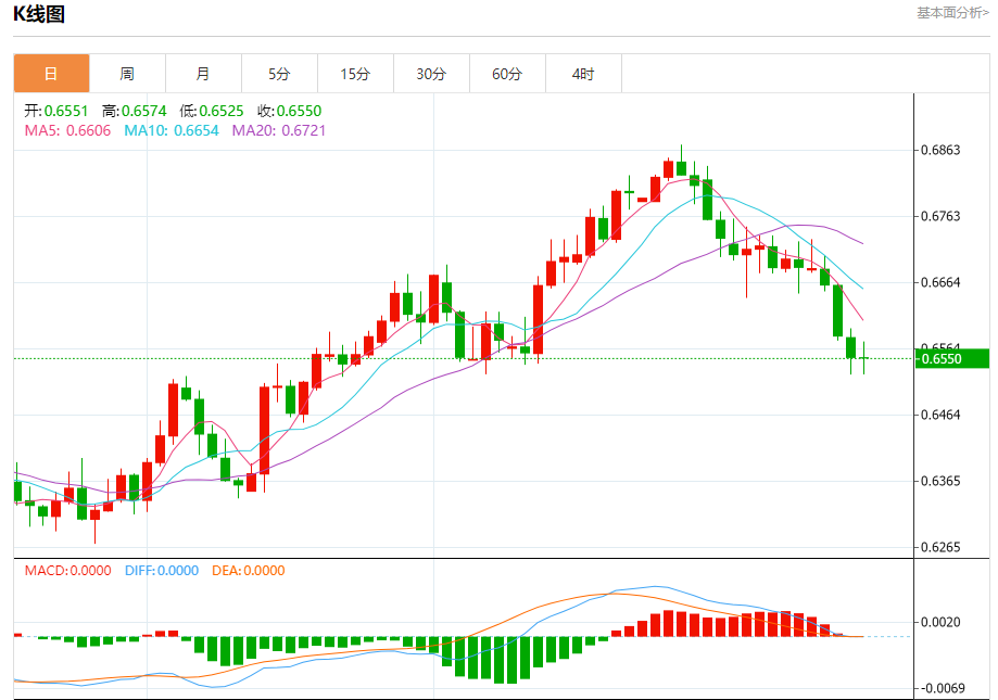 今日周四,澳元兑美元报0.6551,跌幅0.02%;美元兑加元报1.3518,涨幅0.09%;美元兑瑞郎报0.8683,涨幅0.42%。 澳元兑美元汇率分析 技术点评:RI技术指标向上运行。 阻力位:0.66200.66000.6580 支撑位:0.65300.65100.6490 美元兑加元汇率分析