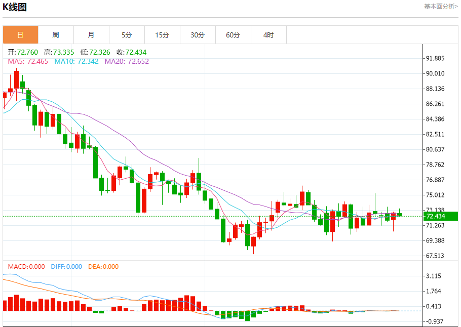 周四盘中,WTI原油报72.444,跌幅0.51%。 今日分析:在72.50之上,看涨,目标价位为73.55,然后为74.10。 技术点评:在72.50之上,为多头信号,向上的目标位为73.55。 支撑位:72.5072.0071.50 阻力位:74.7074.1073.55 (亚汇网编辑:冰凡)