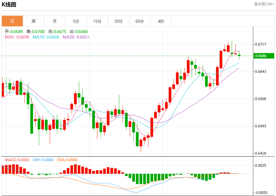 今日周三,澳元兑美元报0.6689,跌幅0.08%;美元兑加元报1.3699,涨幅0.02%;美元兑瑞郎报0.7922,涨幅0.08%。 澳元兑美元汇率分析 技术点评:即使我们不能排除持续技术反弹的可能性,其时间长度上,应该是有限的。 阻力位:0.67400.67250.6700 支撑位:0.66700
