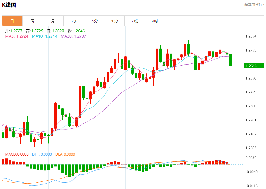 周二盘中,英镑/美元报1.2654,跌幅0.56%。 今日分析:在1.2685之下,看跌,目标价位为1.2605,然后为1.2585。 技术点评:RI技术指标向下运行。 支撑位:1.26051.25851.2570 阻力位:1.27351.27101.2685 (亚汇网编辑:冰凡)