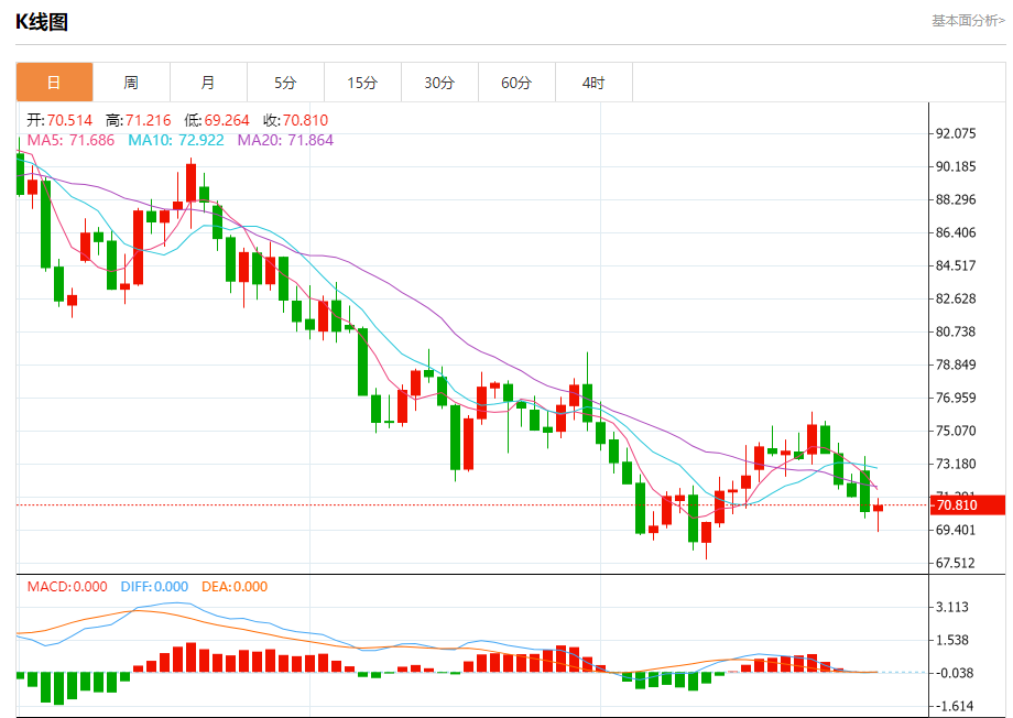 周三盘中,WTI原油报70.961,涨幅0.69%。 今日分析:在70.60之下,看跌,目标价位为69.00,然后为68.30。 技术点评:只要70.60阻力位不被突破,向下跌破69.00位置的风险很高。 支撑位:69.0068.3068.00 阻力位:71.7071.2570.60 (亚汇网编辑:冰