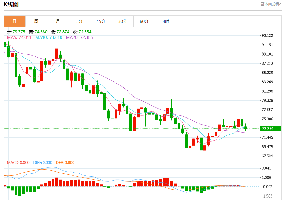 周四盘中,WTI原油报73.329,跌幅0.63%。 今日分析:在74.35之下,看跌,目标价位为73.15,然后为72.80。 技术点评:只要依旧存在74.35阻力位,价格波动存在看跌的趋势。 支撑位:73.1572.8072.40 阻力位:75.3074.8074.35 (亚汇网编辑:冰凡)