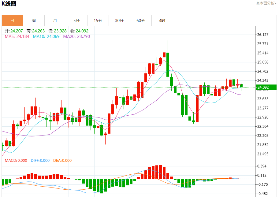 周三盘中,现货白银报24.077,跌幅0.51%。 今日分析:在24.15之下,看跌,目标价位为23.85,然后为23.75。 技术点评:跌破24.15,为空头信号,向下的目标将会是23.85。 支撑位:23.8523.7523.65 阻力位:24.4024.2824.15 (亚汇网编辑:冰凡)