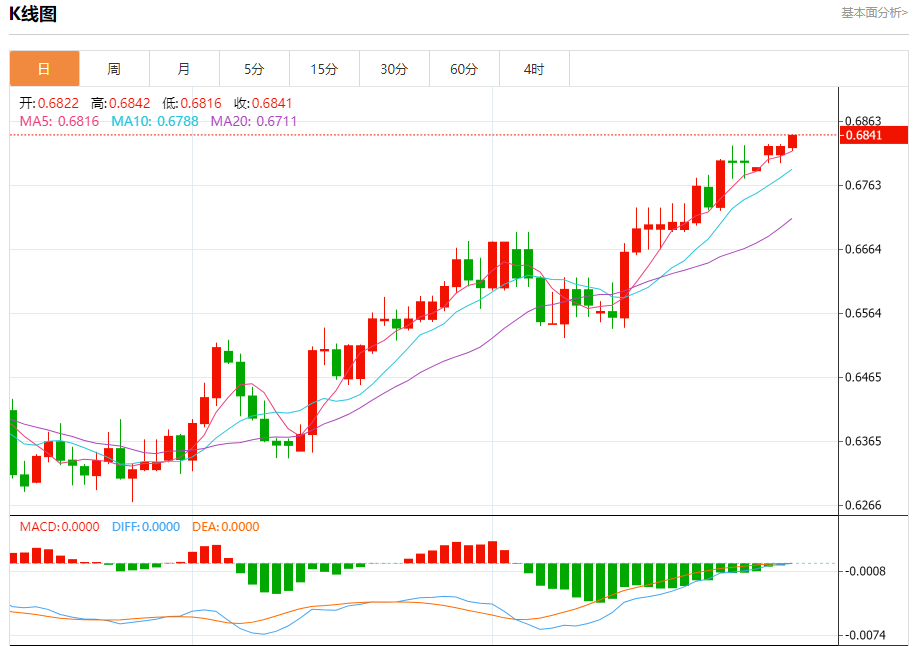 今日周三,澳元兑美元报0.6842,涨幅0.25%;美元兑加元报1.3206,涨幅0.08%;美元兑瑞郎报0.8527,跌幅0.12%。 澳元兑美元汇率分析 技术点评:RI技术指标向上运行。 阻力位:0.68900.68700.6855 支撑位:0.68100.67900.6770 美元兑加元汇率分析