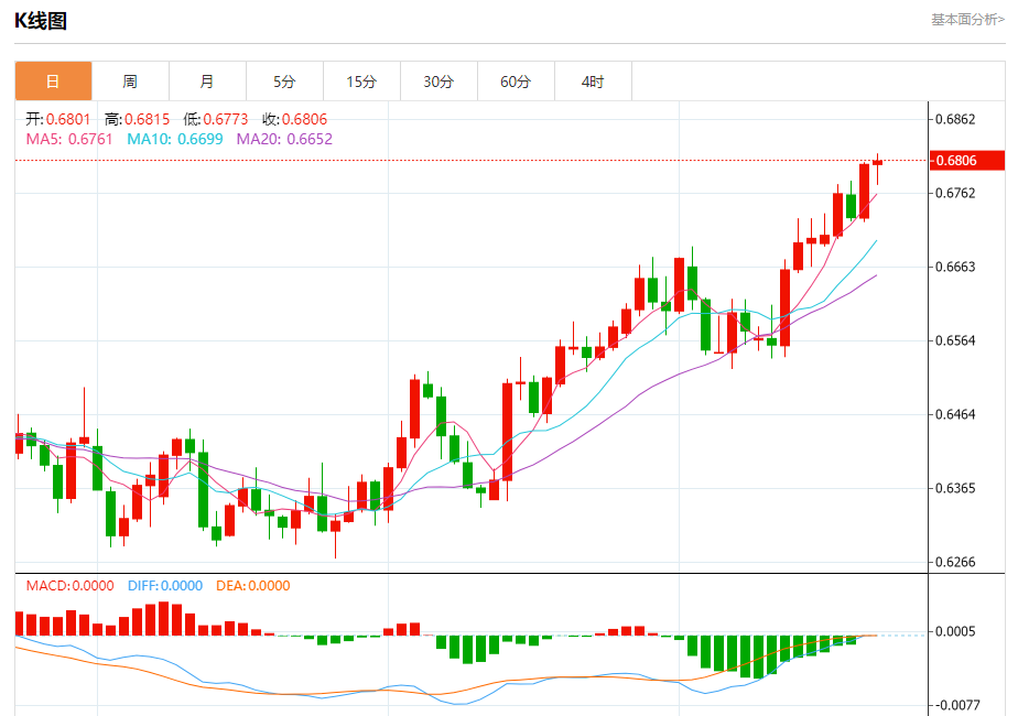 今日周五,澳元兑美元报0.6805,涨幅0.04%;美元兑加元报1.3279,跌幅0.03%;美元兑瑞郎报0.8548,跌幅0.18%。 澳元兑美元汇率分析 技术点评:RI技术指标向上运行。 阻力位:0.68650.68450.6830 支撑位:0.67650.67450.6725 美元兑加元汇率分析