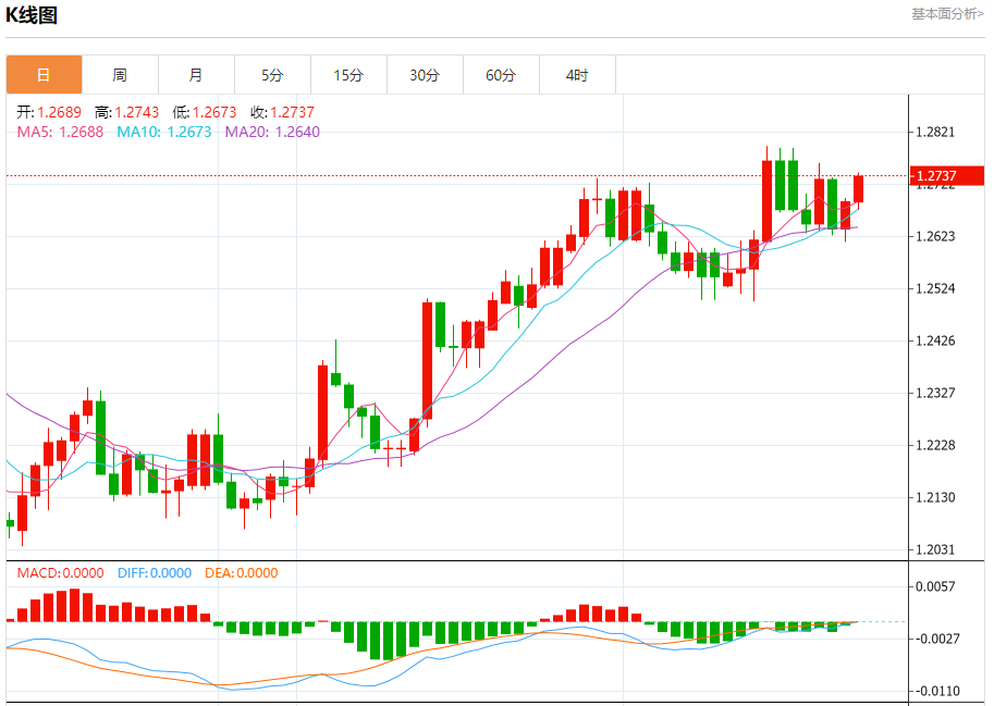 周五盘中,英镑/美元报1.2716,涨幅0.20%。 今日分析:在1.2675之上,看涨,目标价位为1.2760,然后为1.2790。 技术点评:RI技术指标向上运行。 支撑位:1.26751.26451.2610 阻力位:1.28151.27901.2760 (亚汇网编辑:冰凡)