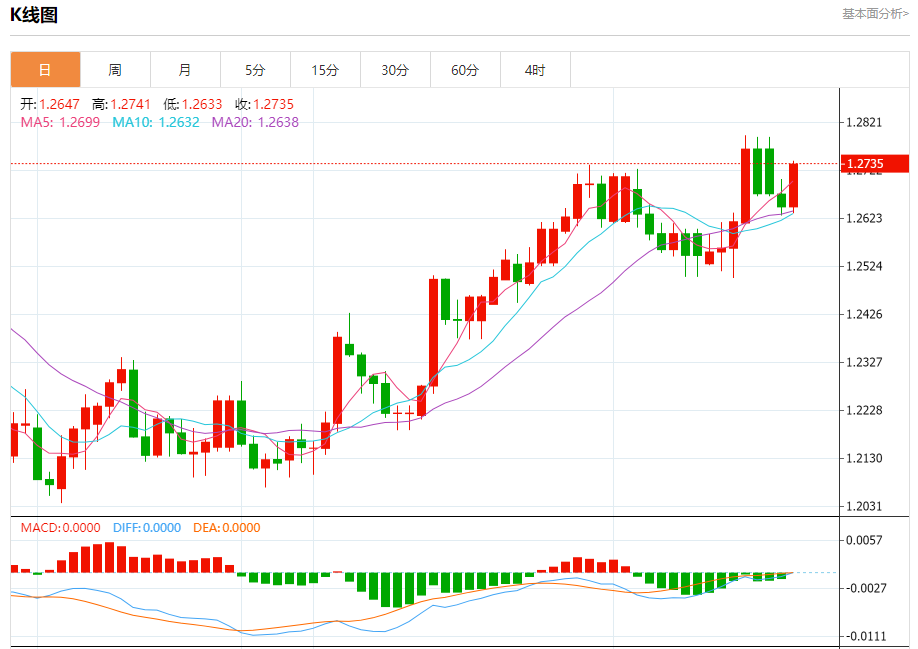 周二盘中,英镑/美元报1.2736,涨幅0.70%。 今日分析:在1.2660之上,看涨,目标价位为1.2725,然后为1.2760。 技术点评:RI技术指标向上运行。 支撑位:1.26601.26251.2585 阻力位:1.27901.27601.2725 (亚汇网编辑:冰凡)