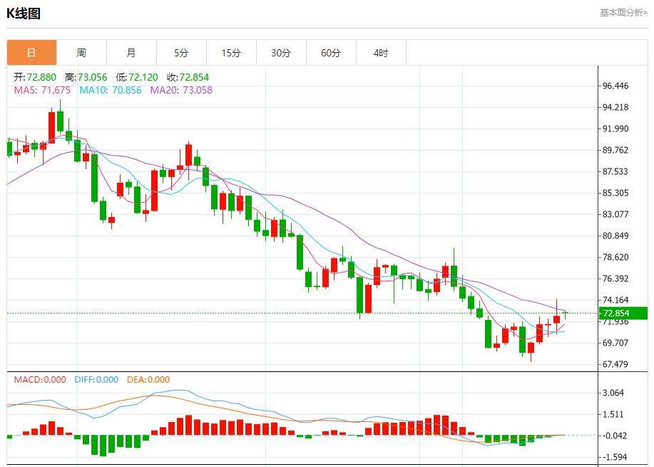 周二盘中,WTI原油报72.701,涨幅0.27%。 今日分析:在73.45之下,看跌,目标价位为72.10,然后为71.60。 技术点评:RI技术指标运行趋势复杂,倾向于下跌。 支撑位:72.1071.6071.00 阻力位:75.4074.6073.45 (亚汇网编辑:冰凡)
