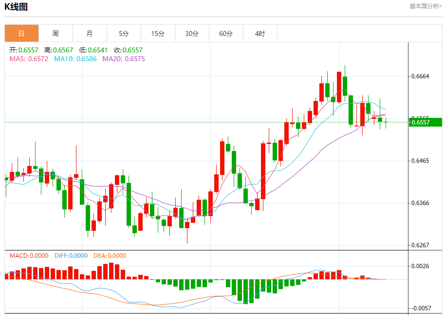 今日周三,澳元兑美元报0.6558,跌幅0.02%;美元兑加元报1.3577,跌幅0.09%;美元兑瑞郎报0.8762,涨幅0.09%。 澳元兑美元汇率分析 技术点评:只要依旧存在0.6570阻力位,价格波动存在看跌的趋势。 阻力位:0.66000.65850.6570 支撑位:0.65350.65250.6510