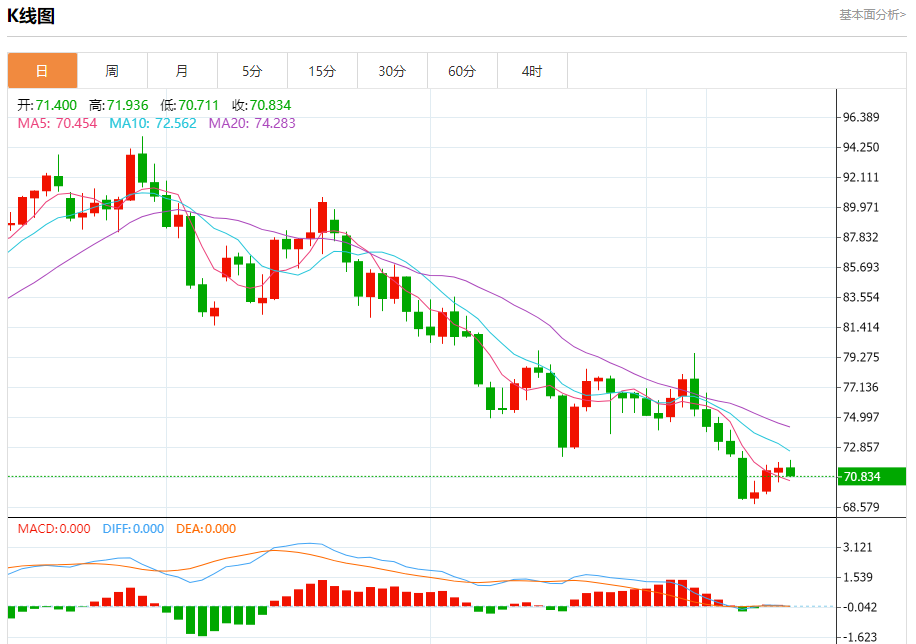 周二盘中,WTI原油报70.829,跌幅0.78%。 今日分析:在71.50之下,看跌,目标价位为70.65,然后为70.25。 技术点评:跌破71.50,为空头信号,向下的目标将会是70.65。 支撑位:70.6570.2569.60 阻力位:72.2072.0071.50 (亚汇网编辑:冰凡)