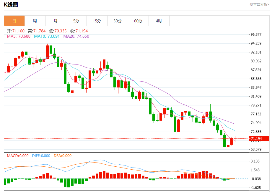周一盘中,WTI原油报71.116,跌幅0.31%。 今日分析:在71.60之下,看跌,目标价位为70.25,然后为69.60。 技术点评:RI技术指标看跌,有进一步下降空间。 支撑位:70.2569.6068.80 阻力位:72.6072.0071.60 (亚汇网编辑:冰凡)