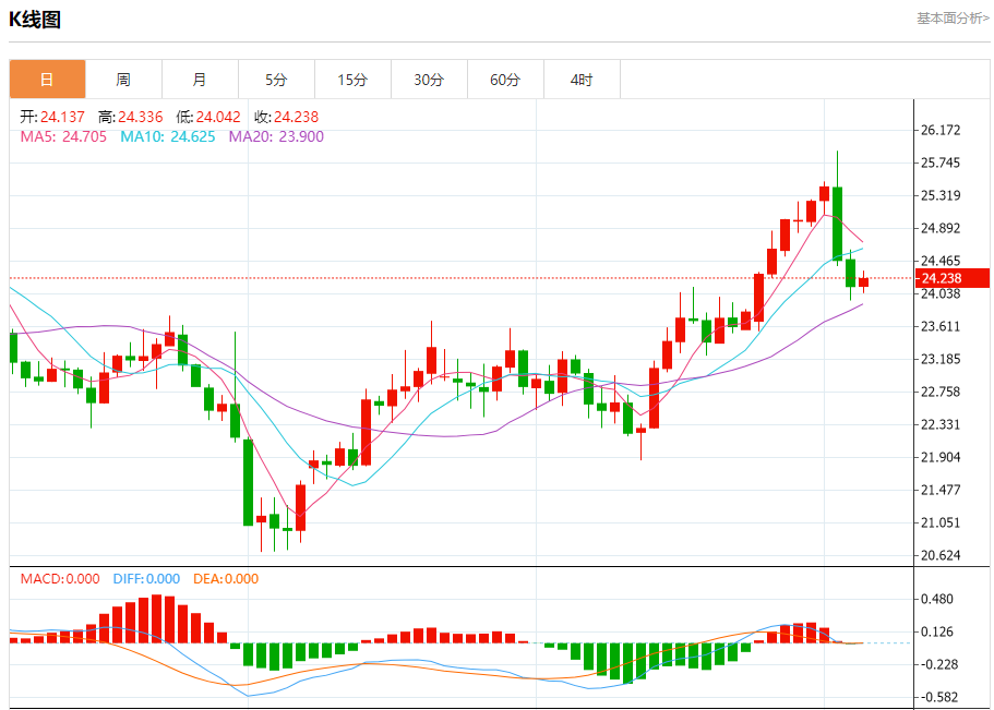 周三盘中,现货白银报24.234,涨幅0.41%。 今日分析:在24.35之下,看跌,目标价位为23.95,然后为23.80。 技术点评:RI技术指标看跌,有进一步下降空间。 支撑位:23.9523.8023.55 阻力位:24.8024.6024.35 (亚汇网编辑:冰凡)
