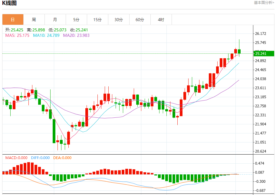 周一盘中,现货白银报25.292,跌幅0.56%。 今日分析:在25.40之下,看跌,目标价位为24.95,然后为24.83。 技术点评:跌破25.40,为空头信号,向下的目标将会是24.95。 支撑位:24.9524.8324.68 阻力位:25.8525.6025.40 (亚汇网编辑:冰凡)