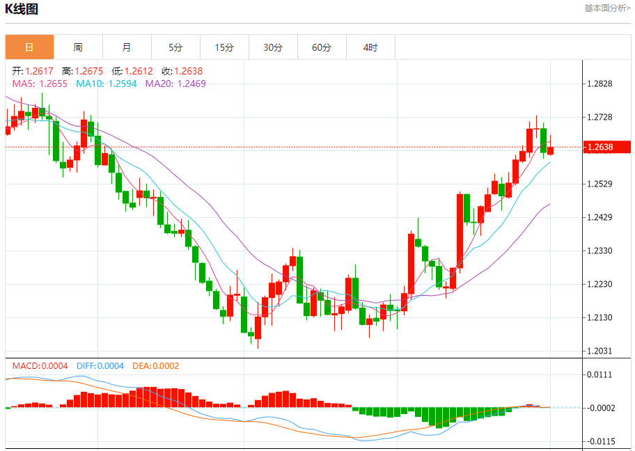 周五盘中,英镑/美元报1.2639,涨幅0.12%。 今日分析:在1.2670之下,看跌,目标价位为1.2600,然后为1.2580。 技术点评:只要依旧存在1.2670阻力位,价格波动存在看跌的趋势。 支撑位:1.26001.25801.2560 阻力位:1.27051.26851.2670 (亚汇网编