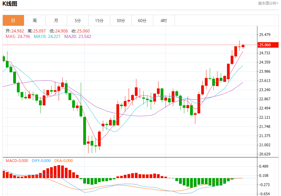 周四盘中,现货白银报25.051,涨幅0.22%。 今日分析:在24.80之上,看涨,目标价位为25.25,然后为25.45。 技术点评:24.80附近形成了一个支撑的底部,将带来走势短期内的稳定。 支撑位:24.8024.6524.50 阻力位:25.6025.4525.25 (亚汇网编辑: