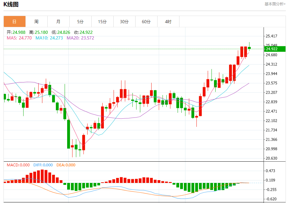 周三盘中,现货白银报24.877,跌幅0.52%。 今日分析:在24.73之上,看涨,目标价位为25.18,然后为25.38。 技术点评:即使我们不能排除持续调整的可能性,其时间长度上,应该是有限的。 支撑位:24.7324.5024.25 阻力位:25.5025.3825.18 (亚汇网