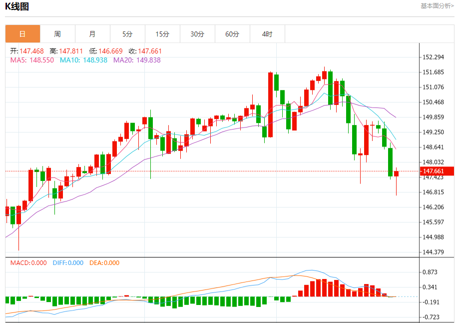周三盘中,美元/日元报147.672,涨幅0.12%。 今日分析:在147.15之上,看涨,目标价位为148.20,然后为148.70。 技术点评:RI技术指标向上运行。 支撑位:147.15146.60146.00 阻力位:149.05148.70148.20 (亚汇网编辑:冰凡)