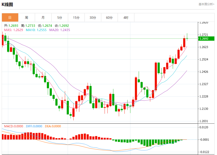 周三盘中,英镑/美元报1.2692,跌幅0.01%。 今日分析:在1.2705之下,看跌,目标价位为1.2665,然后为1.2640。 技术点评:RI技术指标向下运行。 支撑位:1.26651.26401.2610 阻力位:1.27601.27351.2705 (亚汇网编辑:冰凡)