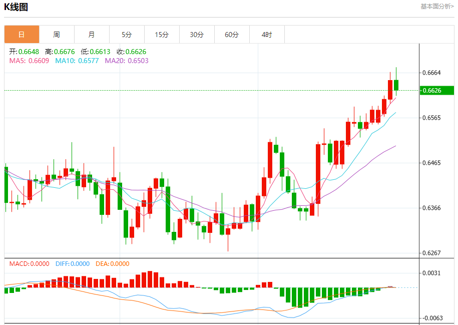 今日周三,澳元兑美元报0.6627,跌幅0.33%;美元兑加元报1.3573,跌幅0.01%;美元兑瑞郎报0.8767,跌幅0.15%。 澳元兑美元汇率分析 技术点评:RI技术指标向下运行。 阻力位:0.66750.66650.6640 支撑位:0.66050.65850.6565 美元兑加元汇率分析