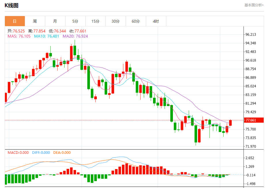 周三盘中,WTI原油报77.545,涨幅1.31%。 今日分析:在76.90之上,看涨,目标价位为77.90,然后为78.50。 技术点评:在76.90之上,为多头信号,向上的目标位为77.90。 支撑位:76.9076.3075.90 阻力位:79.0078.5077.90 (亚汇网编辑:冰凡)