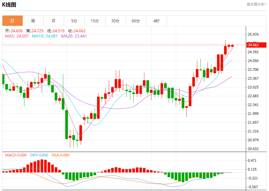 周二盘中,现货白银报24.688,涨幅0.27%。 今日分析:在24.50之上,看涨,目标价位为24.85,然后为25.00。 技术点评:RI技术指标运行趋势复杂,倾向于上涨。 支撑位:24.5024.2524.00 阻力位:25.2025.0024.85 (亚汇网编辑:冰凡)