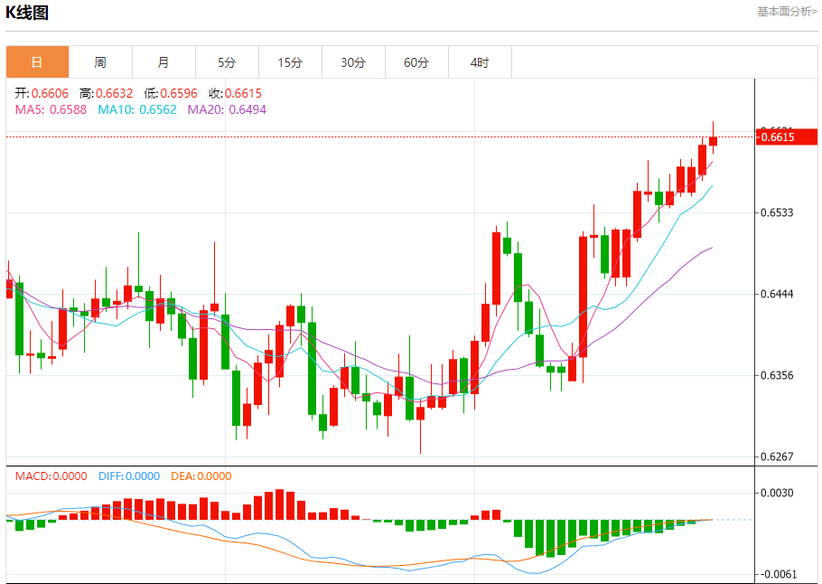 今日周二,澳元兑美元报0.6616,涨幅0.13%;美元兑加元报1.3589,跌幅0.21%;美元兑瑞郎报0.8811,涨幅0.09%。 澳元兑美元汇率分析 技术点评:RI技术指标运行趋势复杂,倾向于上涨。 阻力位:0.66700.66500.6630 支撑位:0.65950.65800.6565 美元