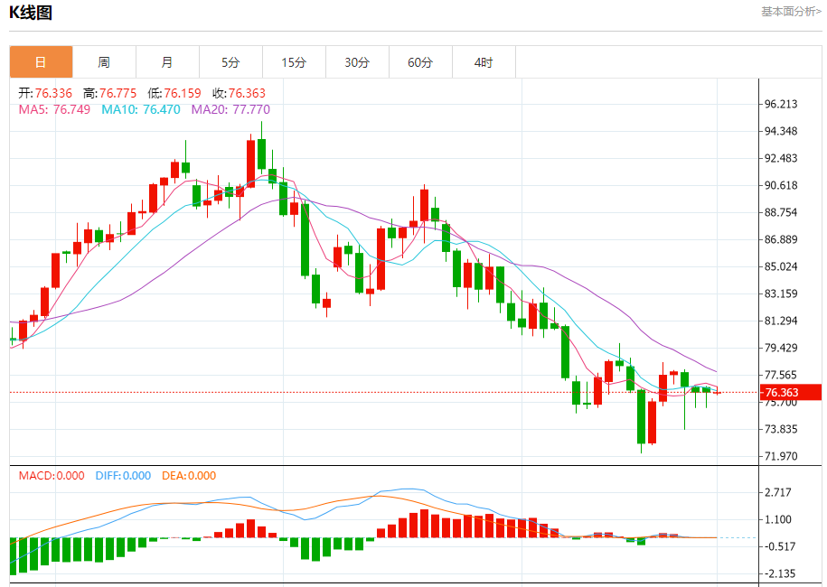 周五盘中,WTI原油报76.092,跌幅0.40%。 今日分析:在76.20之上,看涨,目标价位为77.10,然后为77.50。 技术点评:在76.20之上,为多头信号,向上的目标位为77.10。 支撑位:76.2075.3074.85 阻力位:77.9577.5077.10 (亚汇网编辑:冰凡)