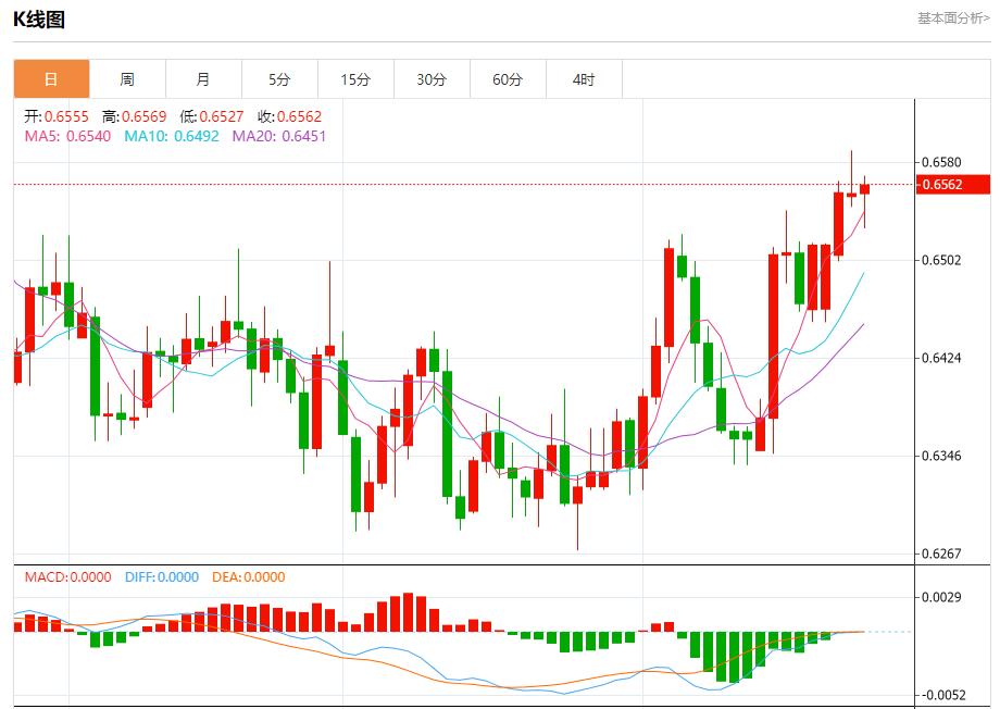 今日周三,澳元兑美元报0.6563,涨幅0.10%;美元兑加元报1.3721,涨幅0.14%;美元兑瑞郎报0.8839,涨幅0.04%。 澳元兑美元汇率分析 技术点评:RI技术指标向上运行。 阻力位:0.66250.66100.6590 支撑位:0.65400.65150.6495 美元兑加