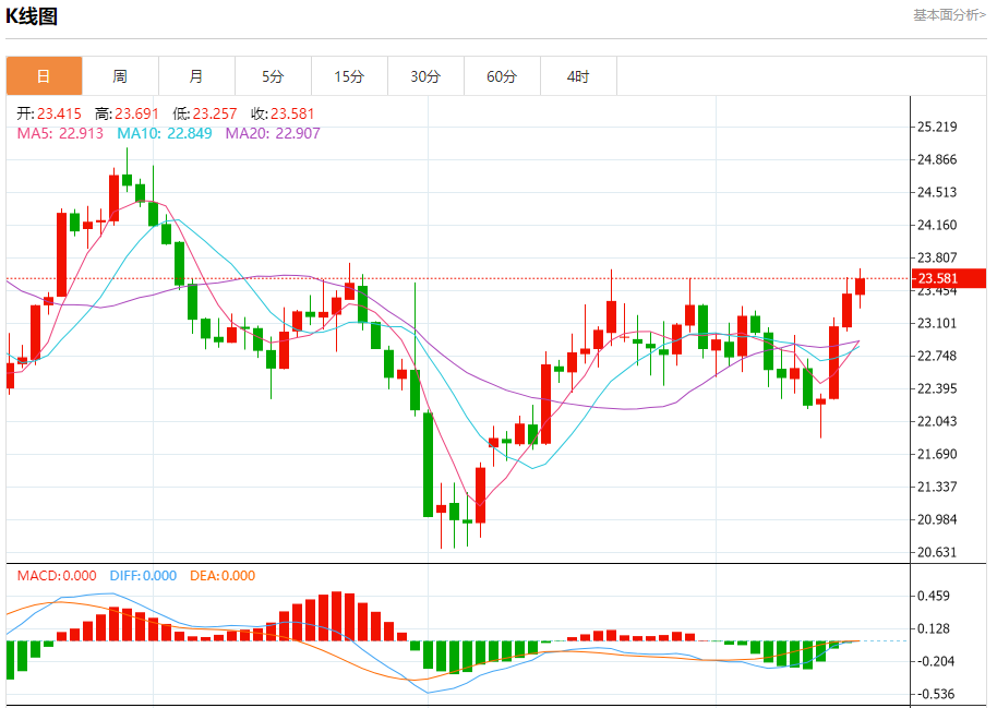 周四盘中,现货白银报23.604,涨幅0.80%。 今日分析:在23.30之上,看涨,目标价位为23.75,然后为23.90。 技术点评:RI技术指标看涨,有进一步向上趋势。 支撑位:23.3023.1723.00 阻力位:24.1023.9023.75 (亚汇网编辑:冰凡)