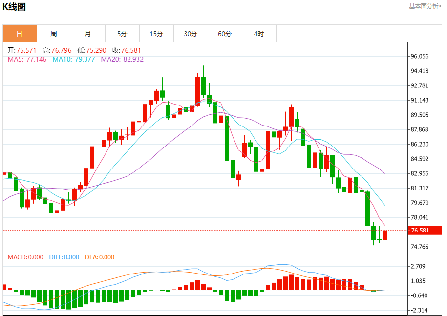 周五盘中,WTI原油报76.520,涨幅1.27%。 今日分析:在75.40之上,看涨,目标价位为76.90,然后为77.50。 技术点评:RI技术指标向上运行。 支撑位:75.4074.9074.00 阻力位:78.0577.5076.90 (亚汇网编辑:冰凡)