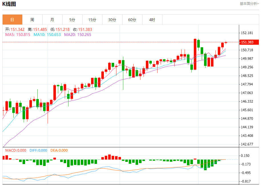 周五盘中,美元/日元报151.414,涨幅0.04%。 今日分析:在151.15之上,看涨,目标价位为151.55,然后为151.75。 技术点评:RI技术指标向上运行。 支撑位:151.15151.05150.80 阻力位:152.00151.75151.55 (亚汇网编辑:冰凡)