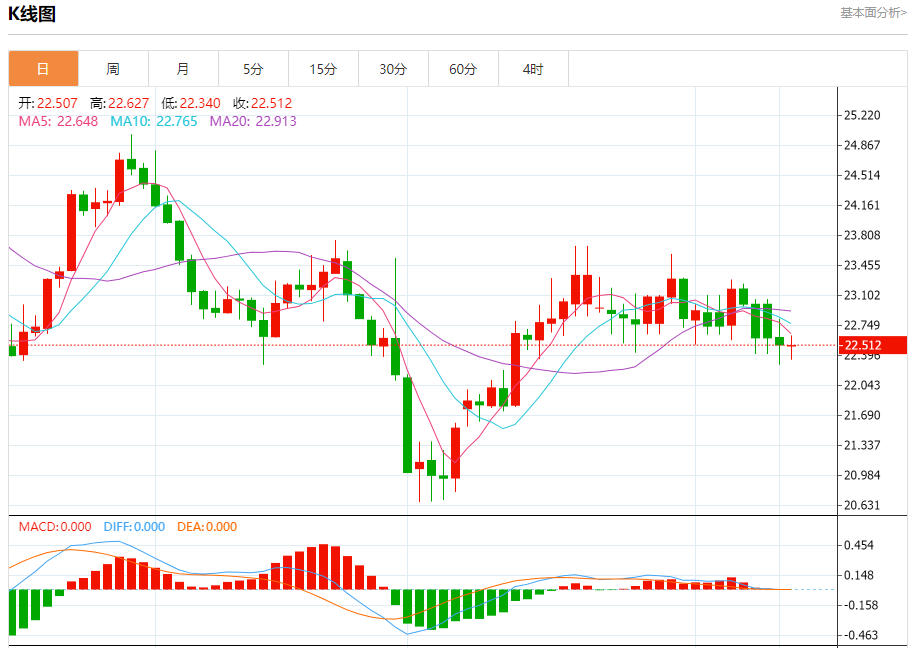 周四盘中,现货白银报22.497,跌幅0.09%。 今日分析:在22.65之下,看跌,目标价位为22.27,然后为22.15。 技术点评:RI技术指标运行趋势复杂,倾向于下跌。 支撑位:22.2722.1522.00? 阻力位:23.0022.8422.65 (亚汇网编辑:冰凡)
