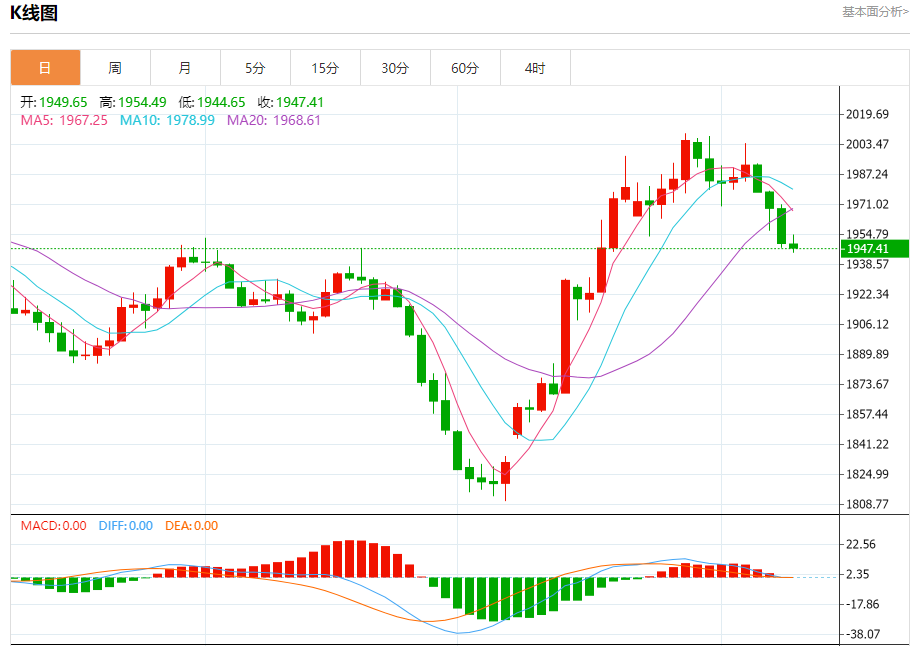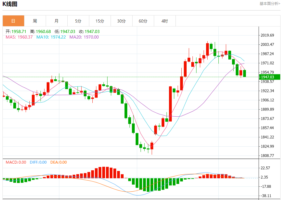 周四盘中,现货黄金报1946.67,跌幅0.17%。 今日分析:在1957.00之下,看跌,目标价位为1943.00,然后为1938.00。 技术点评:RI技术指标运行趋势复杂,倾向于下跌。 支撑位:1943.001938.001932.00 阻力位:1970.001963.001957.00 (亚汇网编辑:
