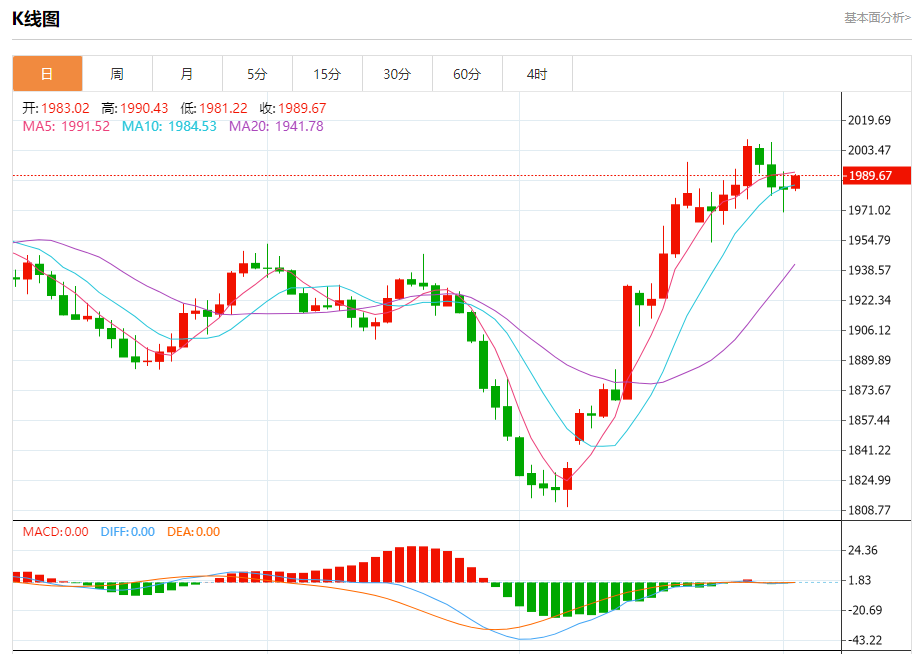 周四盘中,现货黄金报1990.34,涨幅0.39%。 今日分析:在1975.00之上,看涨,目标价位为1992.00,然后为2000.00。 技术点评:RI技术指标向上运行。 支撑位:1975.001969.001963.00 阻力位:2009.002000.001992.00 (亚汇网编辑:冰凡)