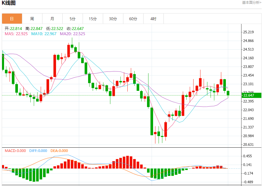 周三盘中,现货白银报22.723,跌幅0.47%。 今日分析:在22.85之下,看跌,目标价位为22.42,然后为22.20。 技术点评:RI技术指标运行趋势复杂,倾向于下跌。 支撑位:22.4222.2022.00 阻力位:23.1523.0022.85 (亚汇网编辑:冰凡)