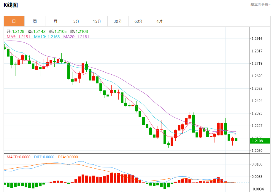 周五盘中,英镑/美元报1.2109,跌幅0.15%。 今日分析:在1.2100之上,看涨,目标价位为1.2155,然后为1.2175。 技术点评:RI技术指标运行趋势复杂,倾向于上涨。 支撑位:1.21001.20751.2050 阻力位:1.22001.21751.2155 (亚汇网编辑:冰凡)