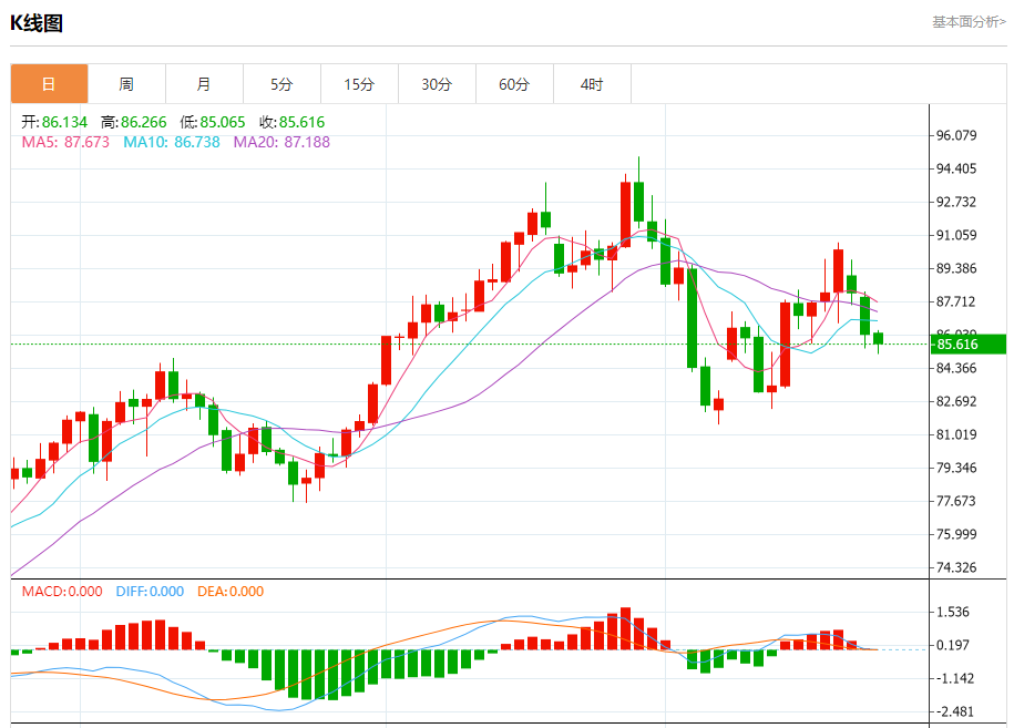 周二盘中,WTI原油报85.541,跌幅0.63%。 今日分析:在75.00之上,看涨,目标价位为98.00,然后为109.00。 技术点评:从技术角度上,RI技术指标在50%中性区域上方。 支撑位:75.0066.0057.00 阻力位:120.00109.0098.00 (亚汇网编辑:冰凡)