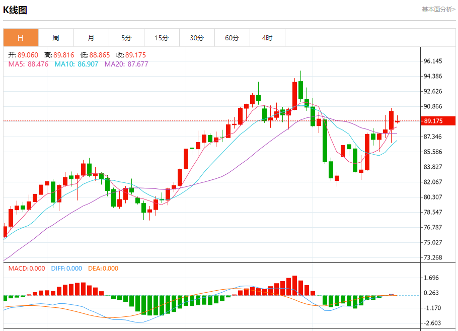 周五盘中,WTI原油报89.174,跌幅1.23%。 今日分析:在88.30之上,看涨,目标价位为90.90,然后为91.70。 技术点评:上升突破88.30阻力位后,将会引发加速上涨至目标位90.90。 支撑位:88.3087.6586.80 阻力位:92.4591.7090.90 (亚汇网编辑:冰