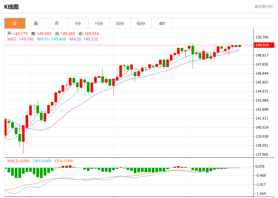 今日周五,截止目前美元兑日元报149.946,上涨0.11%。 日元基本面行情分析 日元兑美元再度逼近150的重要关口,10年期日债收益率攀升至十年新高,日本央行本月第五次干预日本国债市场,日本超宽松政策还将维持多久? 周五,日本央行行长植田和男发表讲话称,日本