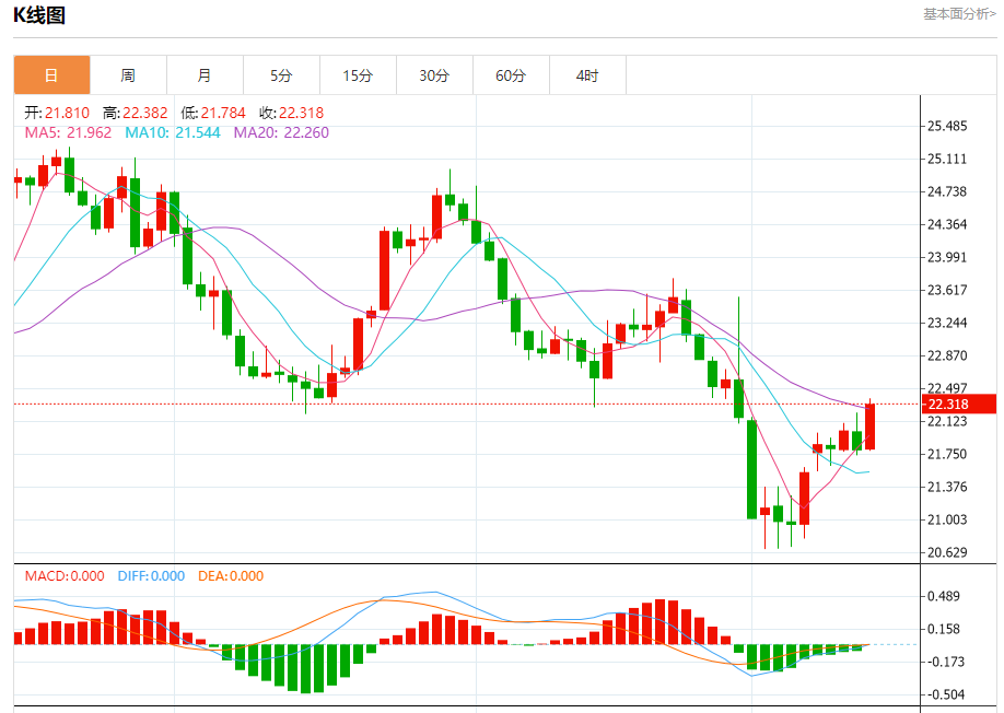 周五盘中,现货白银报22.463,涨幅3.04%。 今日分析:在22.05之上,看涨,目标价位为22.38,然后为22.60。 技术点评:在22.05之上,为多头信号,向上的目标位为22.38。 支撑位:22.0521.9121.75 阻力位:22.8522.6022.38 (亚汇网编辑:冰凡)
