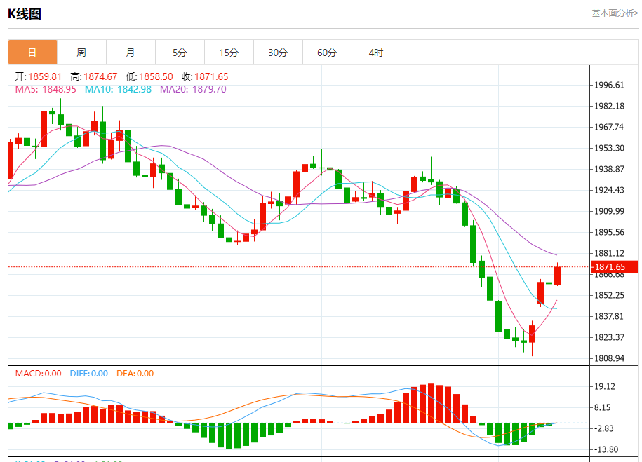 周三盘中,现货黄金报1871.44,涨幅0.60%。 今日分析:在1862.00之上,看涨,目标价位为1879.00,然后为1888.00。 技术点评:上升突破1862.00阻力位后,将会引发加速上涨至目标位1879.00。 支撑位:1862.001858.001853.00 阻力位:1893.001888.001879.00