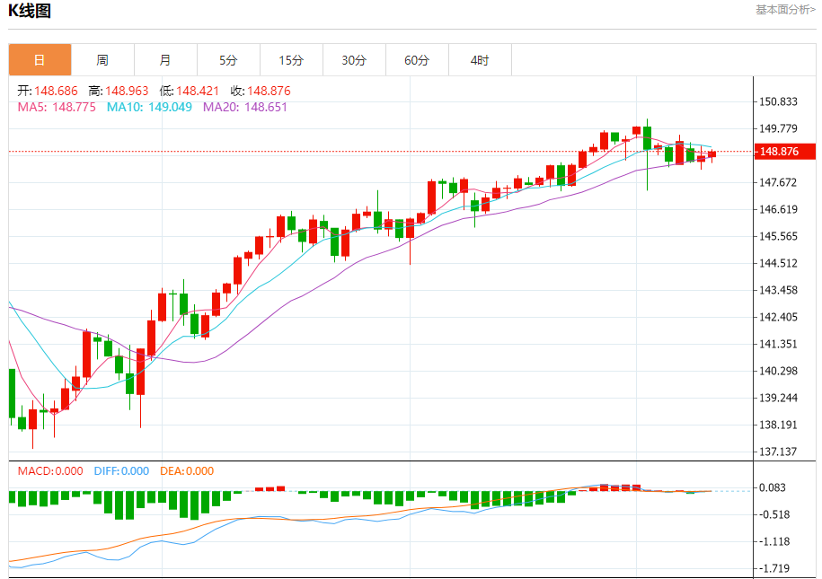 周三盘中,美元/日元报148.888,涨幅0.11%。 今日分析:在148.50之上,看涨,目标价位为148.95,然后为149.10。 技术点评:RI技术指标运行趋势复杂,倾向于上涨。 支撑位:148.50148.35148.15 阻力位:149.30149.10148.95 (亚汇网编辑:冰凡)