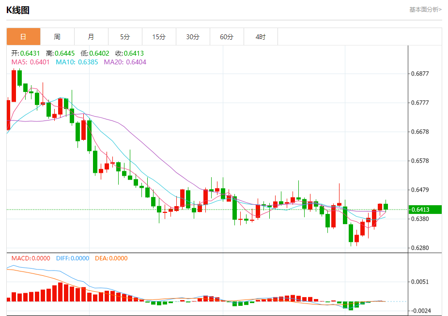 今日周三,澳元兑美元报0.6415,跌幅0.26%;美元兑加元报1.3604,涨幅0.15%;美元兑瑞郎报0.9026,跌幅0.17%。 澳元兑美元汇率分析 技术点评:RI技术指标运行趋势复杂,倾向于上涨。 阻力位:0.64700.64550.6440 支撑位:0.64100.63900.6375 美元