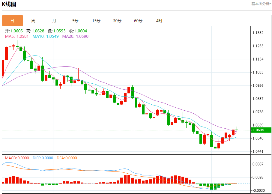 周三晚间,美元指数现报105.837,涨幅0.06%,现对美元兑欧元、英镑、日元主要货币对分析表述如下: 欧元/美元 汇价高见1.0628,低见1.0593。上一交易日,汇价收于1.0605。 基本面:随着全球工业需求低迷出现企稳迹象,欧元区工厂的低迷可能已接近谷底,有理由相信欧元区本季