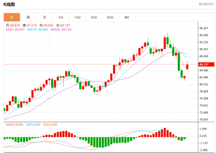 周一盘中,WTI原油报85.976,涨幅3.80%。 今日分析:在84.60之上,看涨,目标价位为87.25,然后为88.20。 技术点评:在84.60之上,为多头信号,向上的目标位为87.25。 支撑位:84.6083.2582.10 阻力位:89.2088.2087.25 (亚汇网编辑:冰凡)