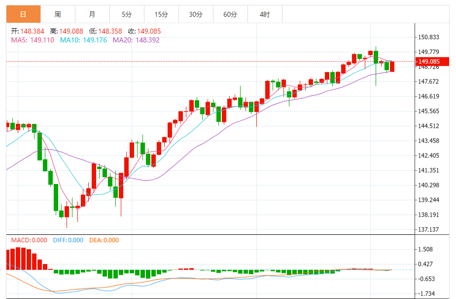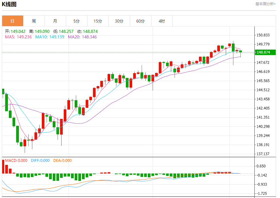 周四盘中,美元/日元报148.896,跌幅0.16%。 今日分析:在148.30之上,看涨,目标价位为149.30,然后为149.65。 技术点评:RI技术指标向上运行。 支撑位:148.30148.00147.60 阻力位:149.95149.65149.30 (亚汇网编辑:冰凡)