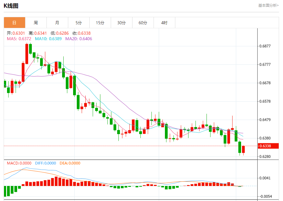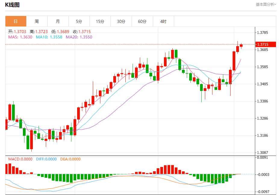今日周三,澳元兑美元报0.6338,涨幅0.56%;美元兑加元报1.3719,涨幅0.08%;美元兑瑞郎报0.9156,跌幅0.58%。 澳元兑美元汇率分析 技术点评:RI技术指标向上运行。 阻力位:0.63950.63700.6350 支撑位:0.63000.62800.6260 美元兑加元汇率分析