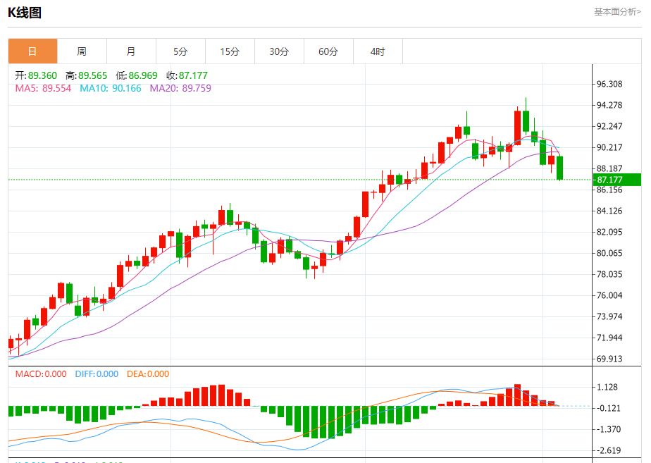 周三盘中,WTI原油报87.093,跌幅2.60%。 今日分析:在88.80之下,看跌,目标价位为87.10,然后为86.50。 技术点评:RI技术指标看跌,有进一步下降空间。 支撑位:87.1086.5086.10 阻力位:90.2089.5588.80 (亚汇网编辑:冰凡)