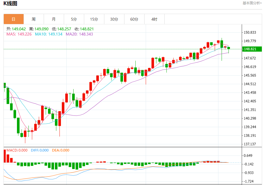 今日周四,截止目前美元兑日元报148.835,下跌0.20%。 日元基本面行情分析 根据周四日本央行公布的经常账户余额预估初值,分析师认为,周二日元汇率跌破150后,日本央行并未干预市常货币经纪商CtralTahiCo.的首席经理YoukTakahaa表示,如果当局进行了干预,政府资金流动应该会出现