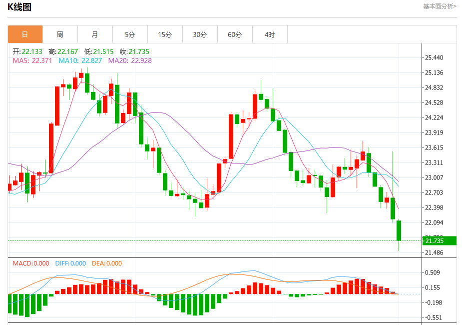 周一盘中,现货白银报21.599,跌幅2.58%。 今日分析:在22.03之下,看跌,目标价位为21.35,然后为21.20。 技术点评:其即时趋势维持向下,有较强的动能。 支撑位:21.3521.2021.00 阻力位:22.4022.2022.03 (亚汇网编辑:冰凡)